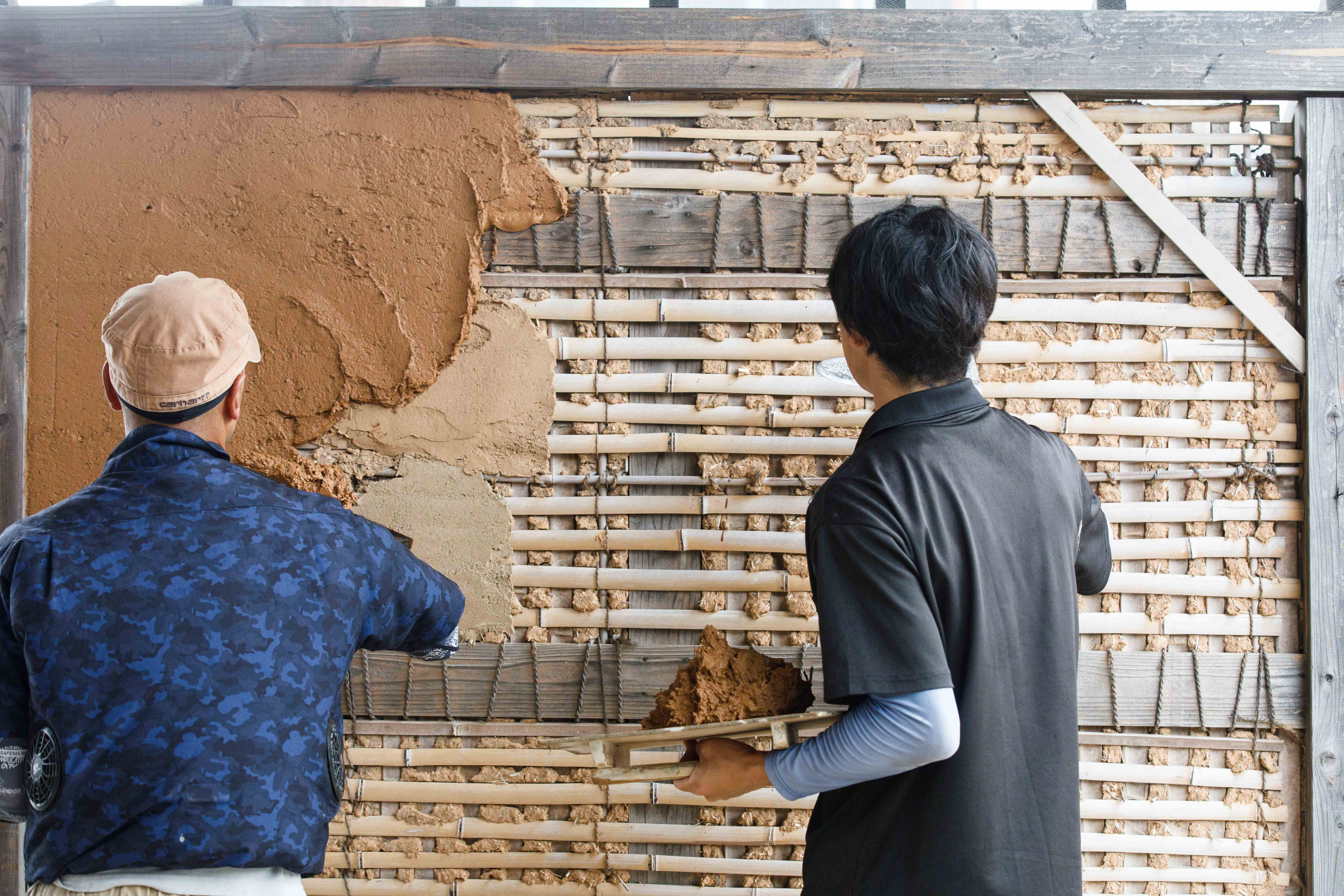 練り上げた土を壁に塗り上げます。素材を知り尽くした職人の技が光ります。